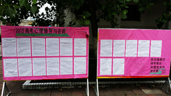 2015年高考临近,五月中旬,民盟宜丰中学支部发挥特长与优势,与县政协宣教文体专委会联合进行了考前分学科指导与心理咨询活动,李阳生、张雷、申美华等盟员就高考学科进行了个别咨询辅导,闻芳梅老师则就考前心理及应对进行了应急疏导,获得学生家长的好评。图为高考考前心理辅导的展板。
