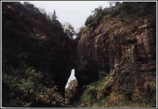 石牛相斗 石牛相斗景观位于宜丰与万载县交界处,有两石突兀高耸,两山高处各向中间突出,下部则悬空成一大洞,有泉水流过,
